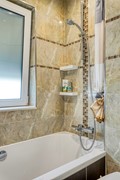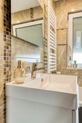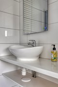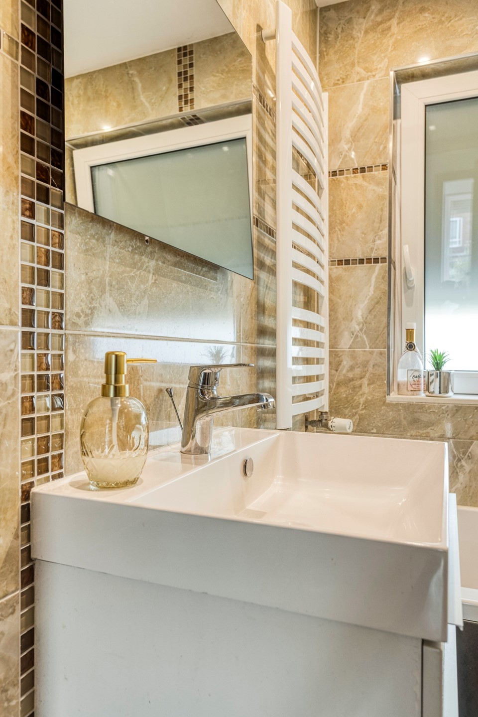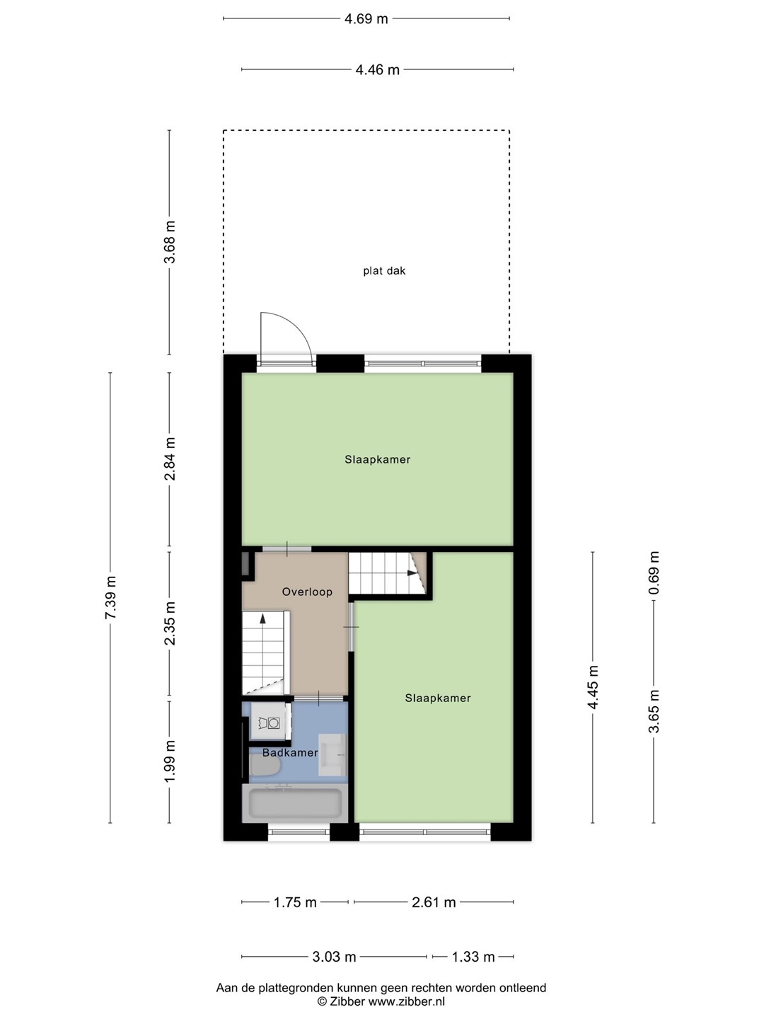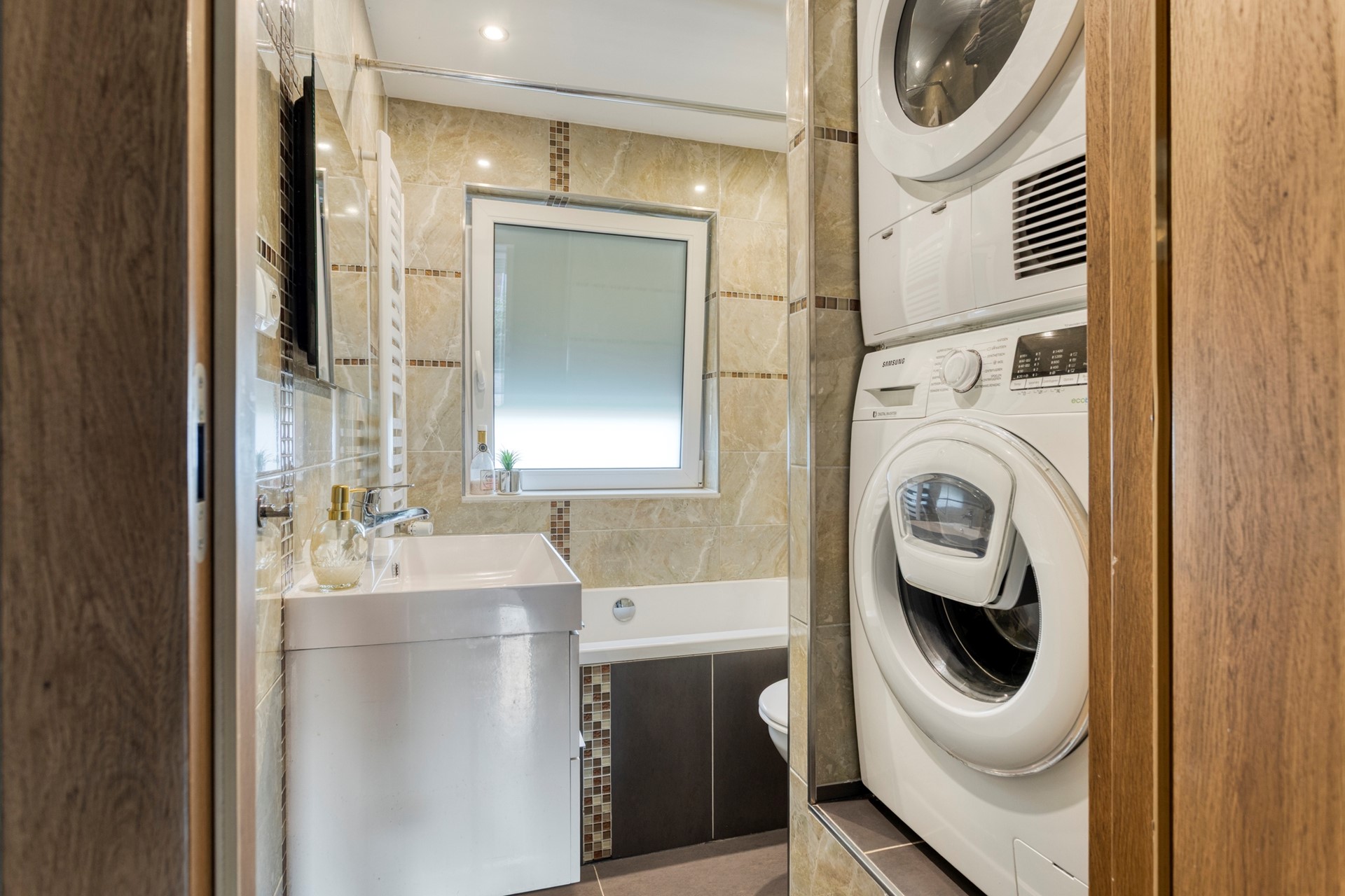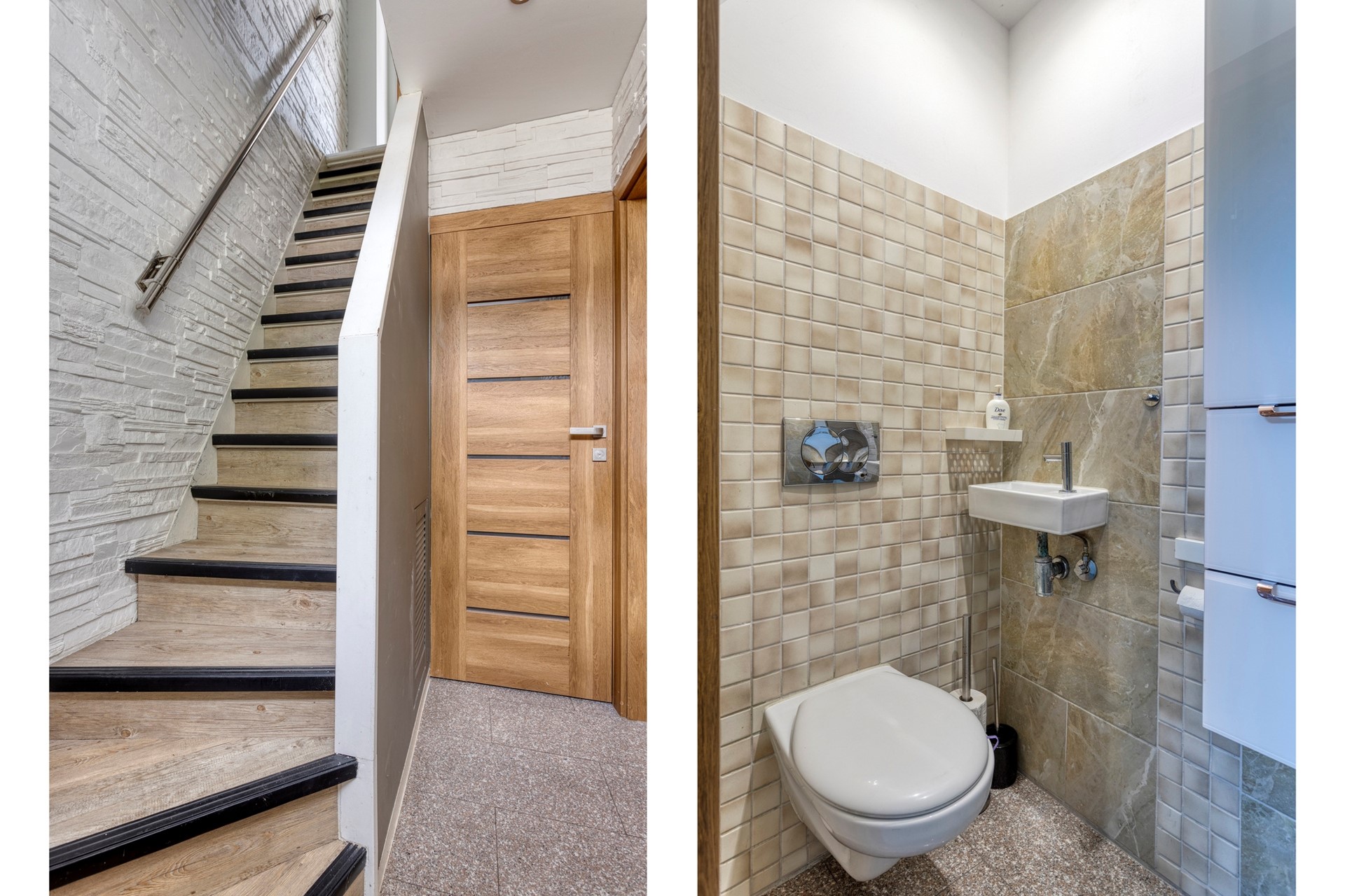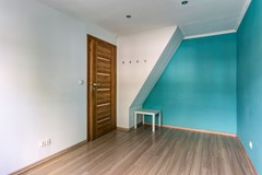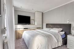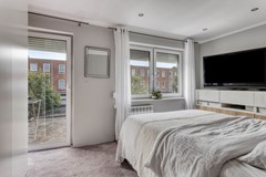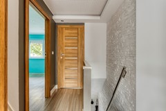 Overloop met vaste trap naar de tweede verdieping. Twee slaapkamers en een moderne badkamer. De ruime eerste slaapkamer aan de achterzijde biedt toegang tot een fijn dakterras boven de uitbouw. De tweede slaapkamer bevindt zich aan de voorzijde. De stijlvolle badkamer is voorzien van een ligbad/douchecombinatie, tweede toilet, wastafelmeubel en aansluiting voor de wasmachine.