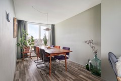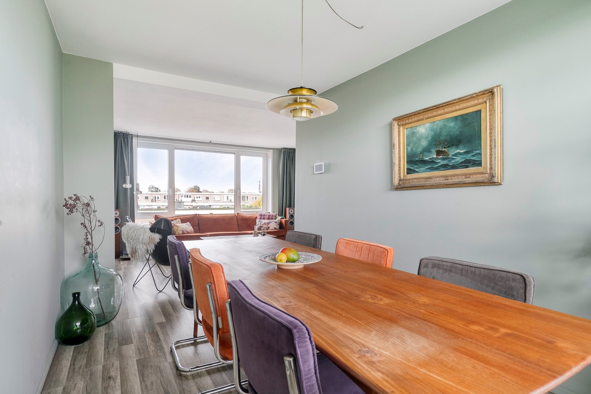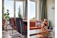 De lichte, sfeervolle woonkamer in L-vorm beschikt over grote raampartijen, waardoor er veel natuurlijk licht binnenvalt. Hier kun je genieten van een fraai uitzicht over de straat en kijk je ver weg, zelfs over de huizen aan de overkant heen.