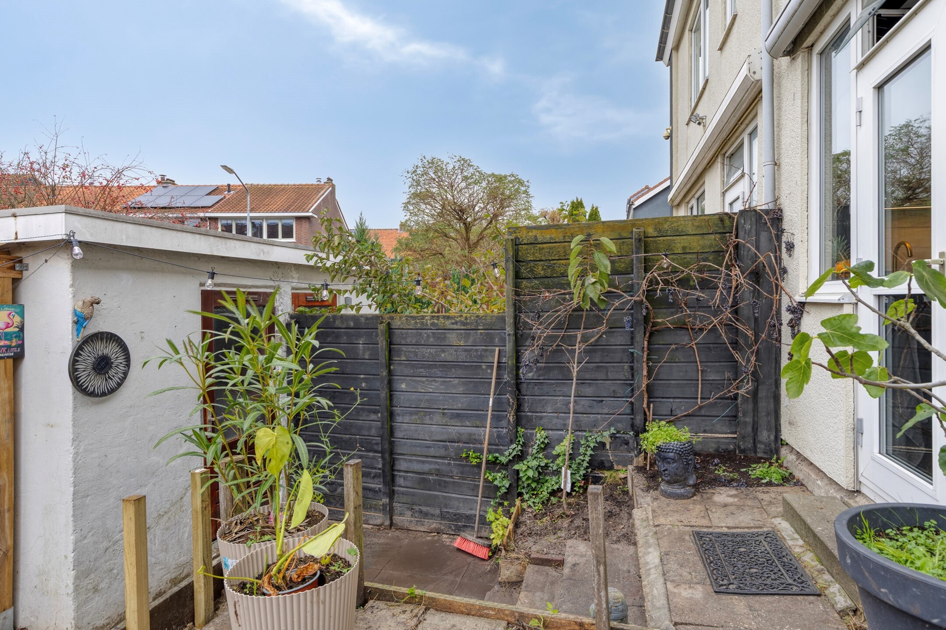 Aan de achtergevel hangt een elektrische zonwering over de breedte van de woning. De zonnige tuin (gelegen op het zuiden) is speels verdeeld over twee niveaus. In de hoek van de tuin staat een stenen berging met elektra en via de poort heb je toegang tot de gemeenschappelijke achterom.