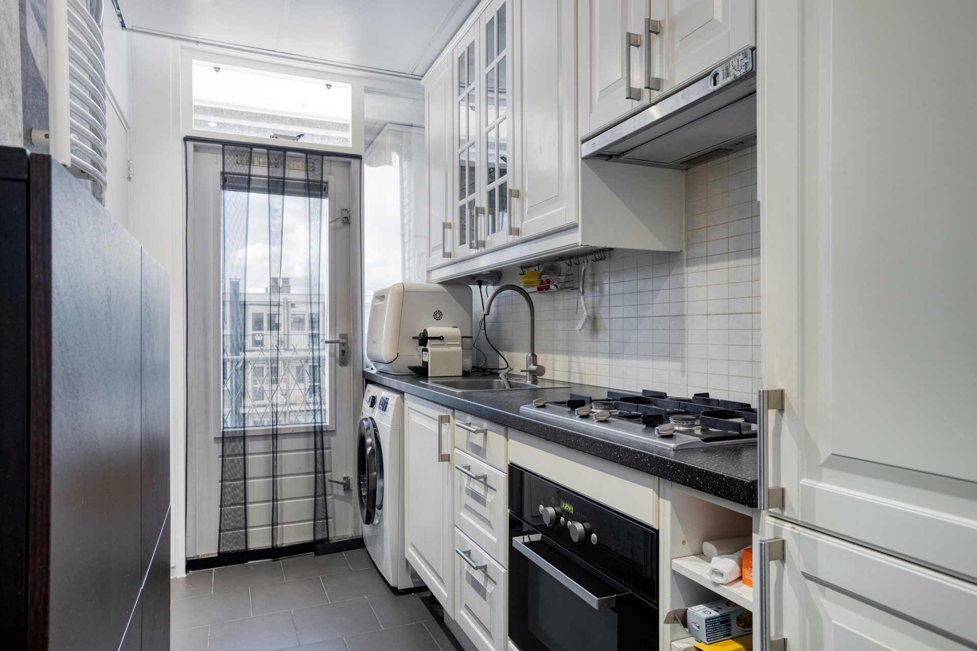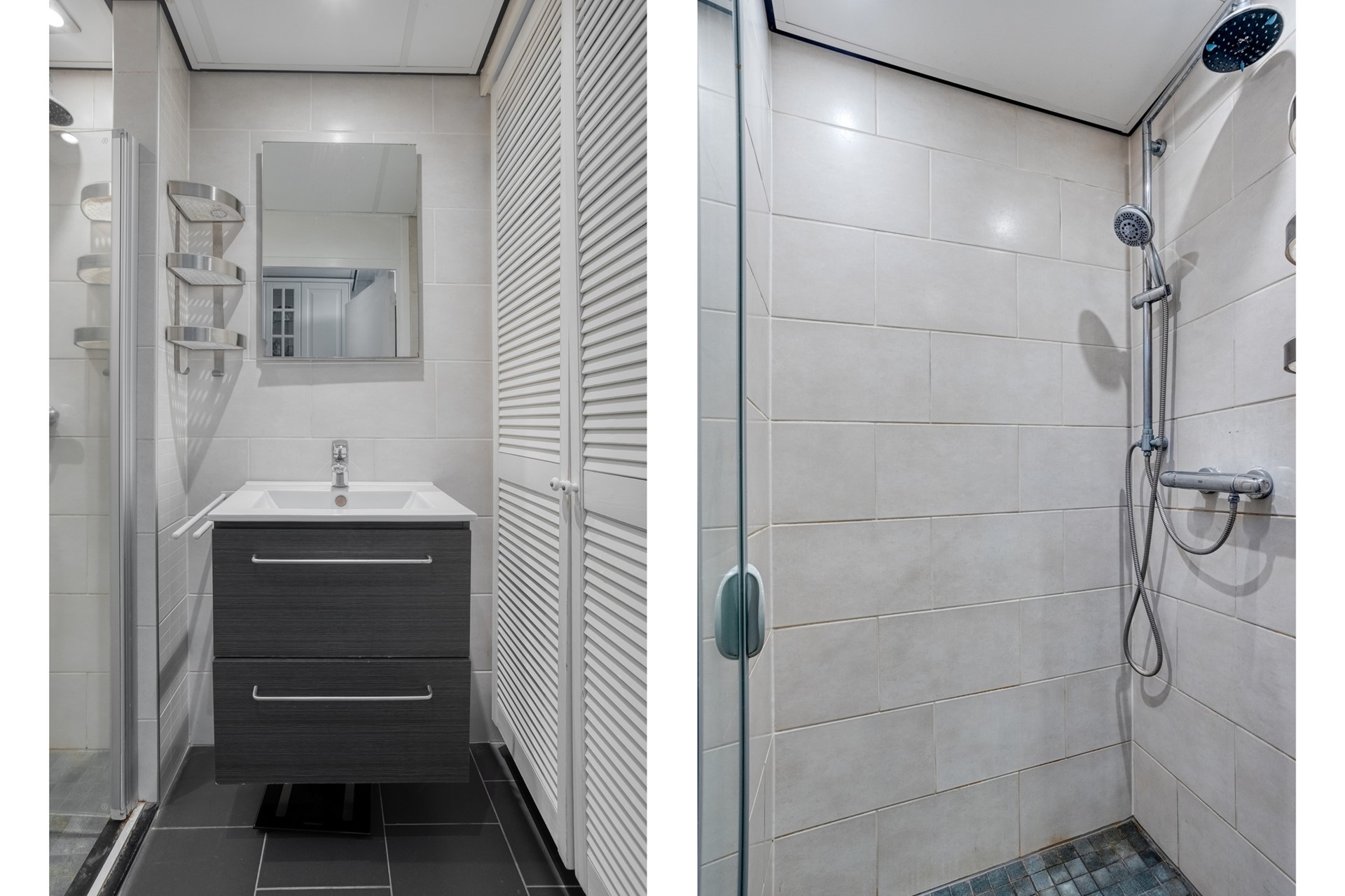 De lichte keuken is voorzien van een combi-oven, rvs-gaskookplaat met afzuigkap, koelkast en een kleine (losse) vaatwasser. Hier vind je ook de aansluiting voor de wasmachine en toegang tot het tweede balkon, waar je ’s middags van de zon kunt genieten, vanuit de keuken bereik je de badkamer, uitgerust met een douche en wastafel.