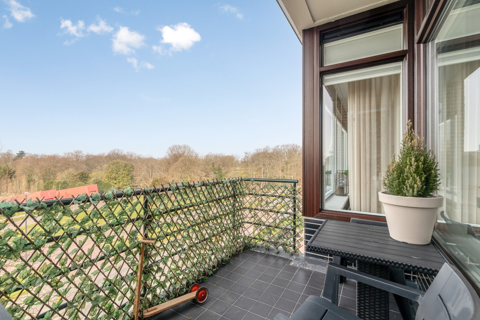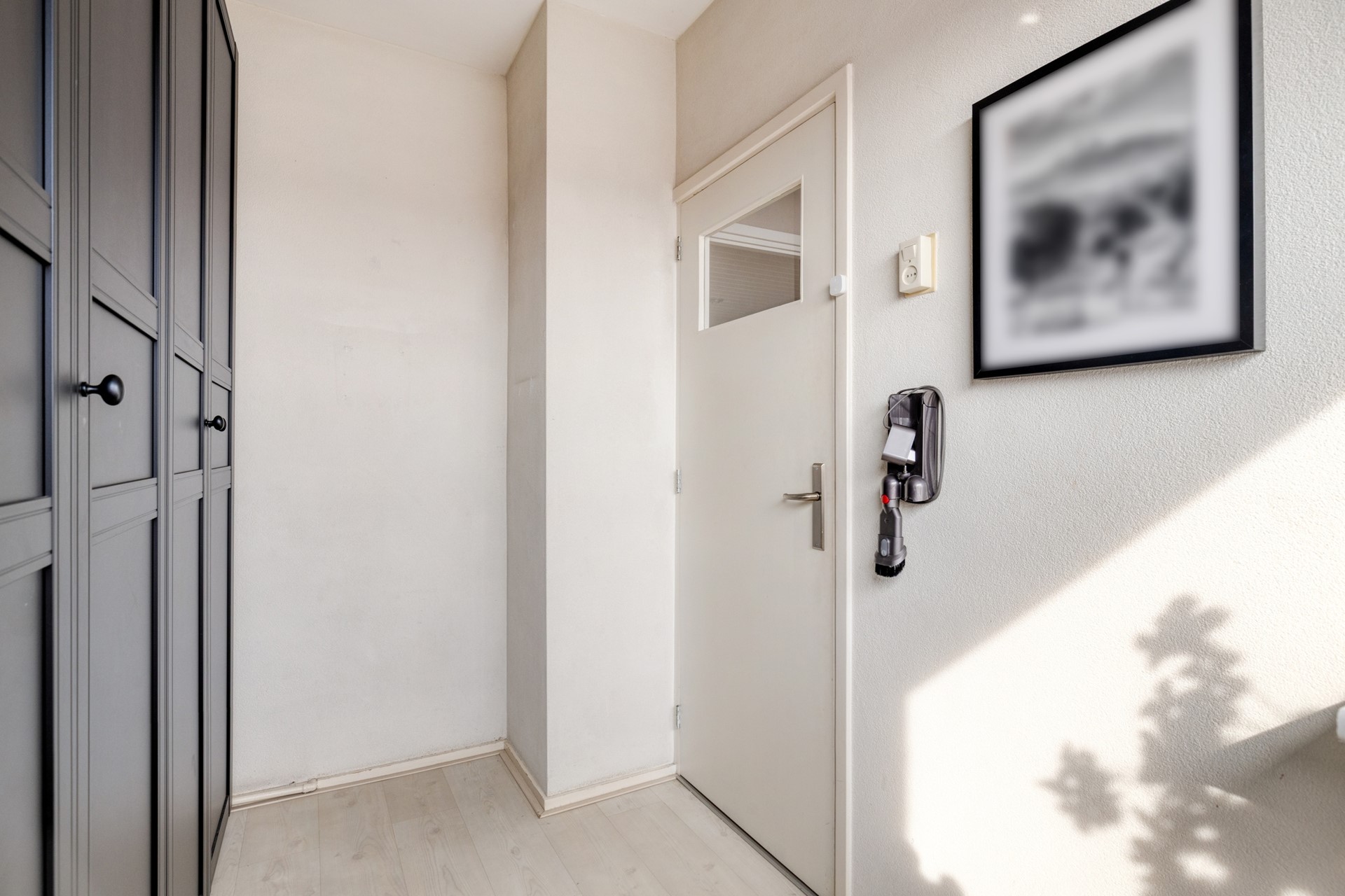 Entree, ruime hal, intercom, meterkast en toegang tot alle vertrekken. De lichte en sfeervolle woonkamer kenmerkt zich door grote raampartijen, waardoor je geniet van een mooi uitzicht op het groen en een overvloed aan natuurlijk licht. De ruimte is afgewerkt met een nieuwe laminaatvloer en beschikt over airconditioning (2024). Vanuit de woonkamer bereik je het op het westen gelegen fijne balkon.