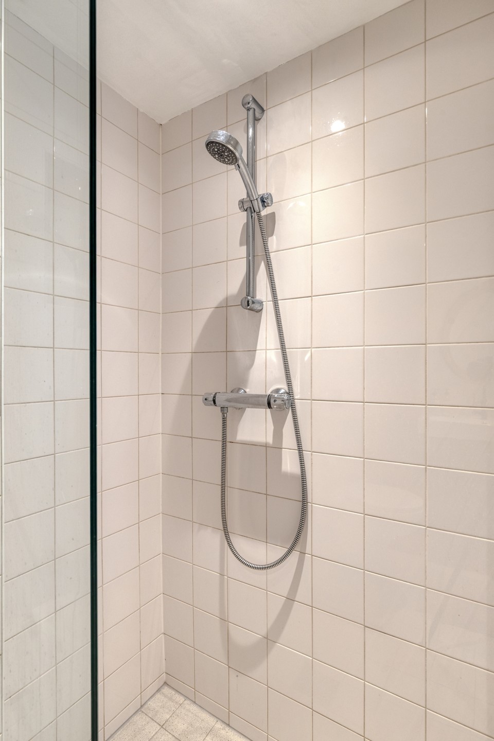 De badkamer is voorzien van een douche, toilet, wastafelmeubel met spiegel en een op maat gemaakte kast met opstelplaats voor de wasmachine en eventueel een droger.