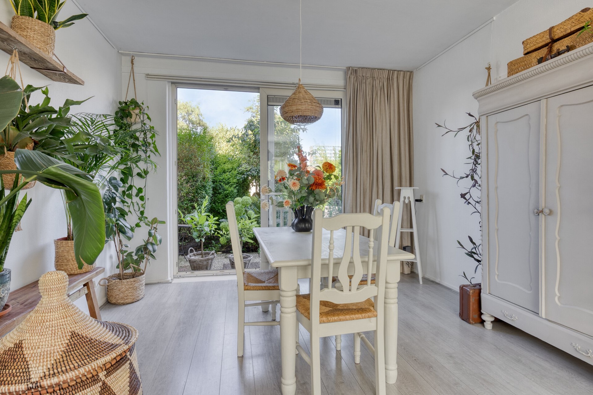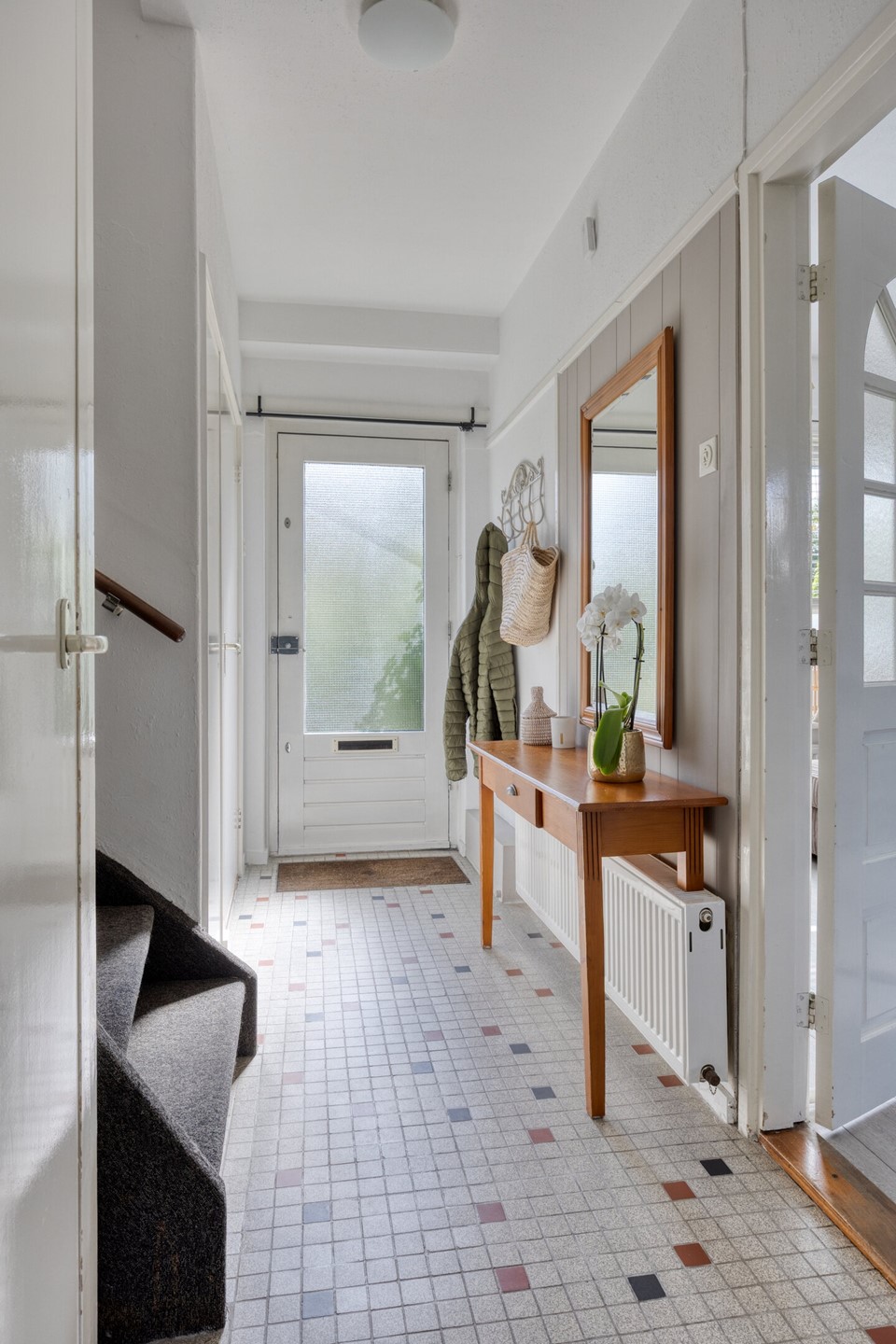 Bij binnenkomst ervaart u direct een warme en lichte sfeer. De ruime hal biedt toegang tot het toilet, de meterkast, de trap naar de eerste verdieping en de doorzonwoonkamer. Dankzij de grote ramen geniet u hier van veel daglicht en een prettig uitzicht op de zonnige achtertuin. Via de schuifpui stapt u zo de tuin in.