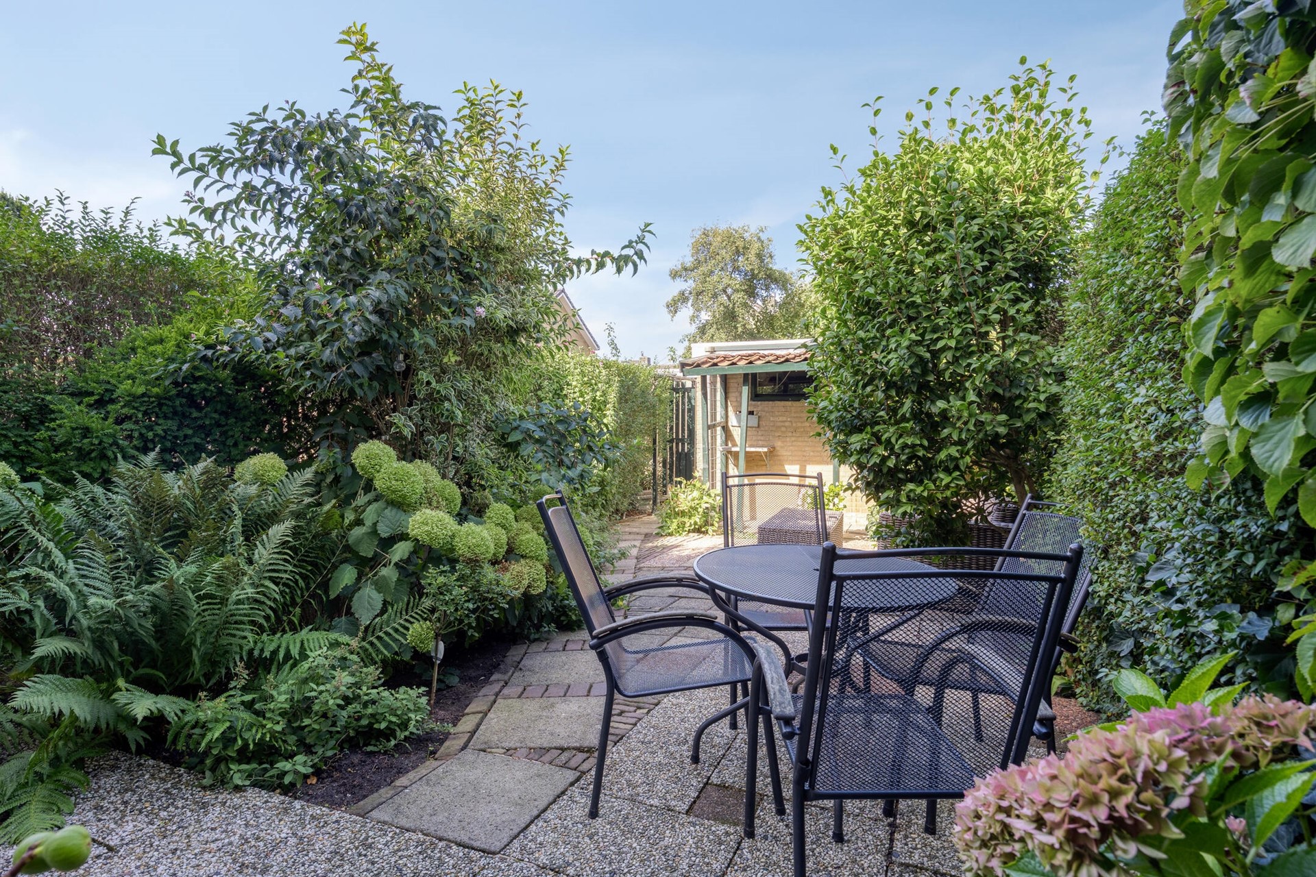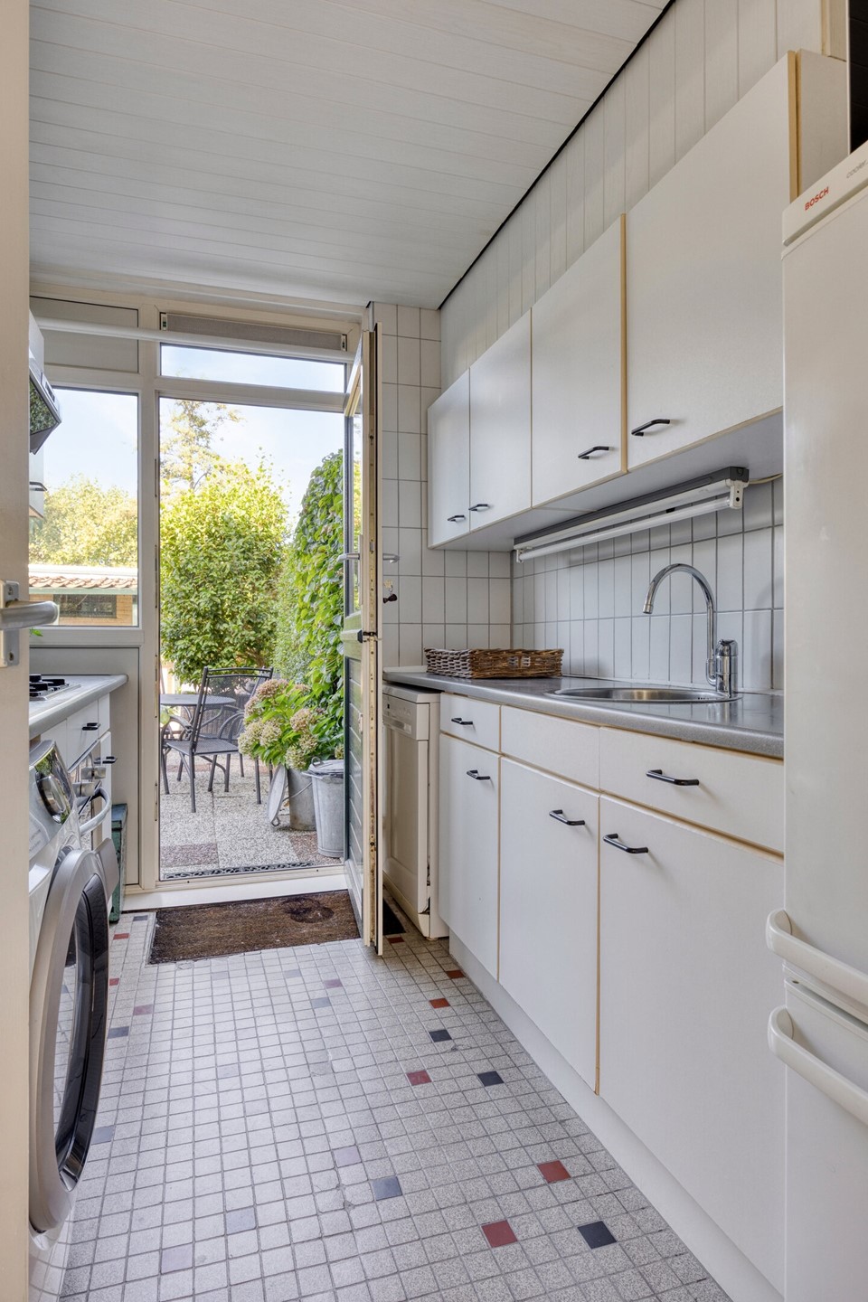 De keuken is voorzien van diverse inbouwapparatuur, waaronder een gaskookplaat met oven, vaatwasser en afzuigkap. Daarnaast staat er een losse koel-/vriescombinatie. Vanuit de keuken is eveneens de achtertuin bereikbaar. De tuin is gelegen op het zuidoosten, beschikt over een stenen berging met elektra en een praktische achterom.